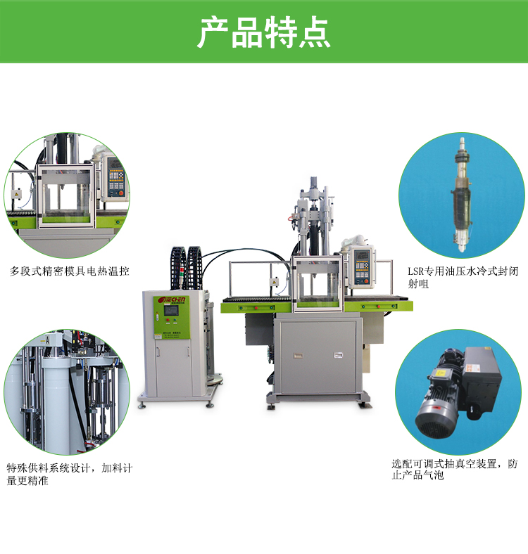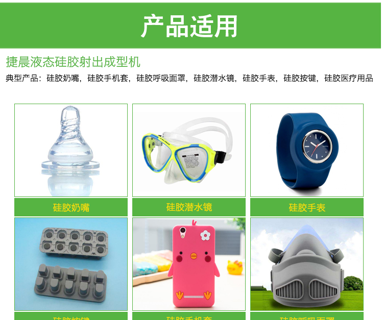 本公司生產(chǎn)的液態(tài)硅膠射出機廣泛用于醫(yī)療、成人、嬰童用品、汽車配件、電子配件、文具、體育、潛水用具等產(chǎn)品,并研發(fā)出微量精密液態(tài)硅橡膠射出機,液體硅膠(固轉(zhuǎn)液)智能供料機,全方位滿足不同客戶的各種需求。